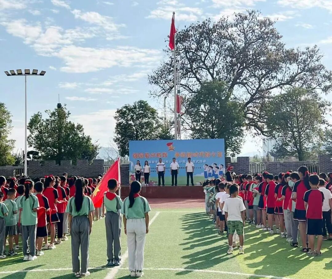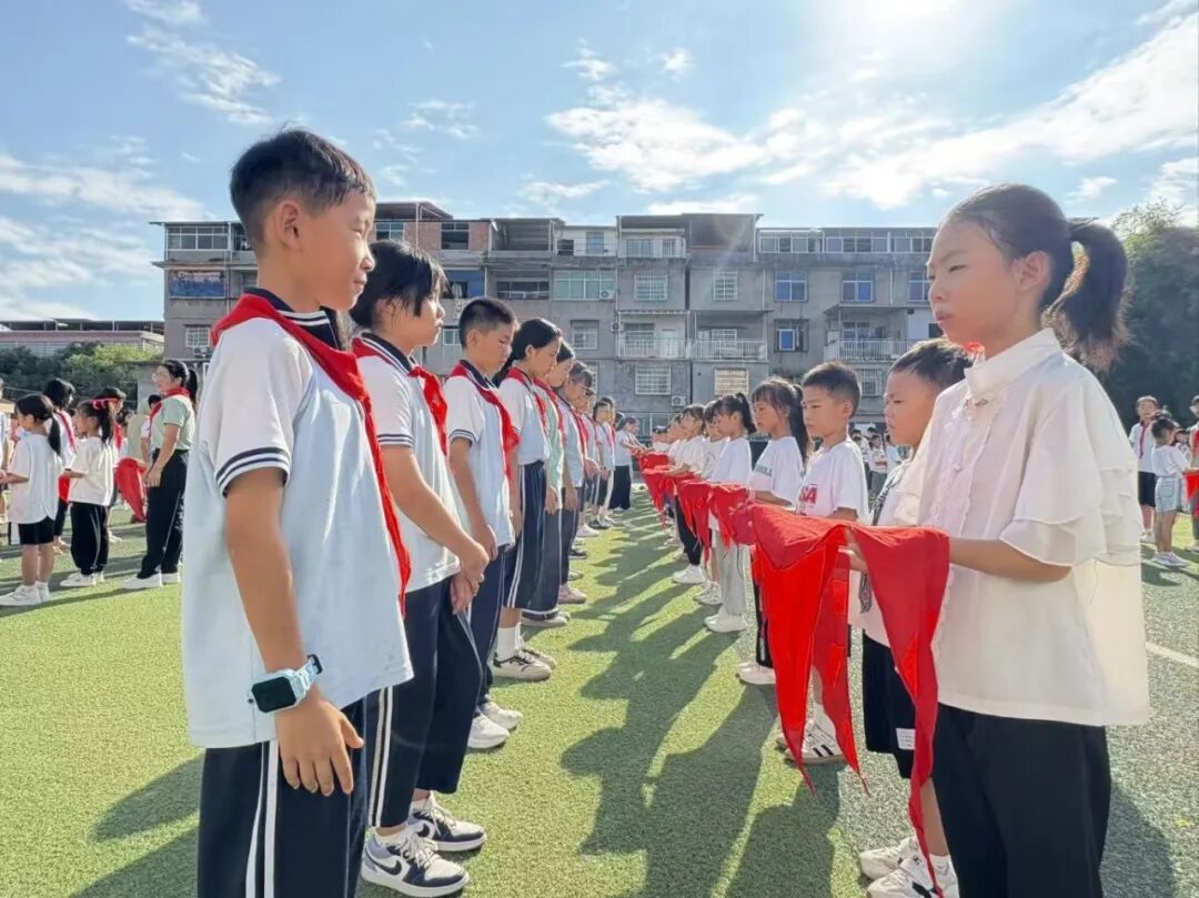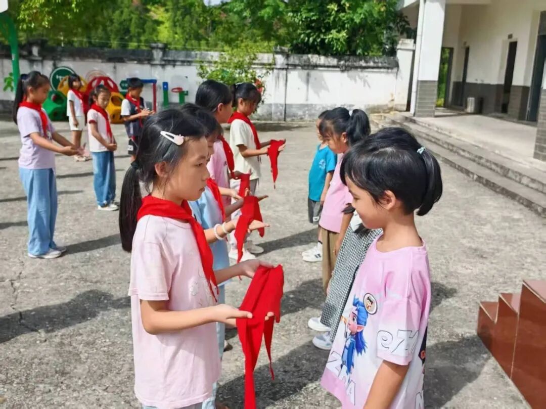 在华融瑞金希望小学,新队员在老队员的帮助下佩戴上红领巾,面向队旗庄严宣誓,表达了为共产主义事业贡献力量的坚定决心。