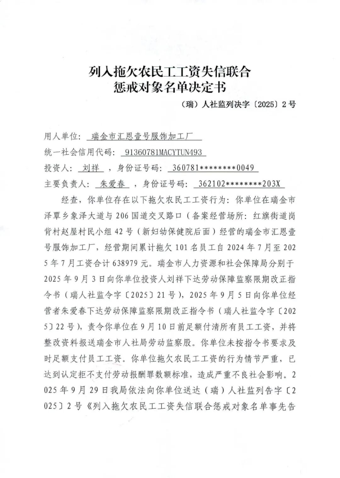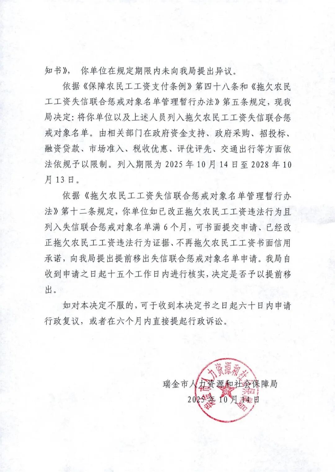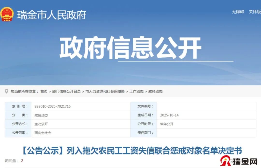 刚刚,瑞金网小编从瑞金市人民政府网部门信息公开目录栏了解到,瑞金市人力资源和社会保障局发布了《【公告公示】列入拖欠农民工工资失信联合惩戒对象名单决定书》,详情如下: