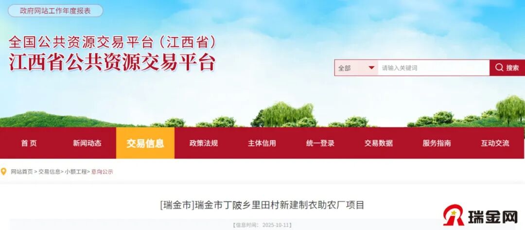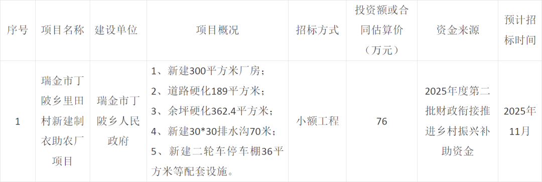 刚刚,瑞金网小编从江西省公共资源交易平台网获悉,瑞金市丁陂乡里田村新建制衣助农厂项目招标意向公示发布,总投资约76万元,2025年11月招标。