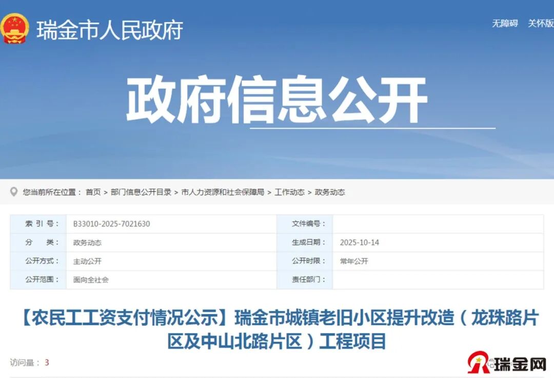 刚刚,瑞金网小编从瑞金市人民政府网部门信息公开目录栏了解到,公开了《【农民工工资支付情况公示】瑞金市城镇老旧小区提升改造(龙珠路片区及中山北路片区)工程项目》,详情如下: