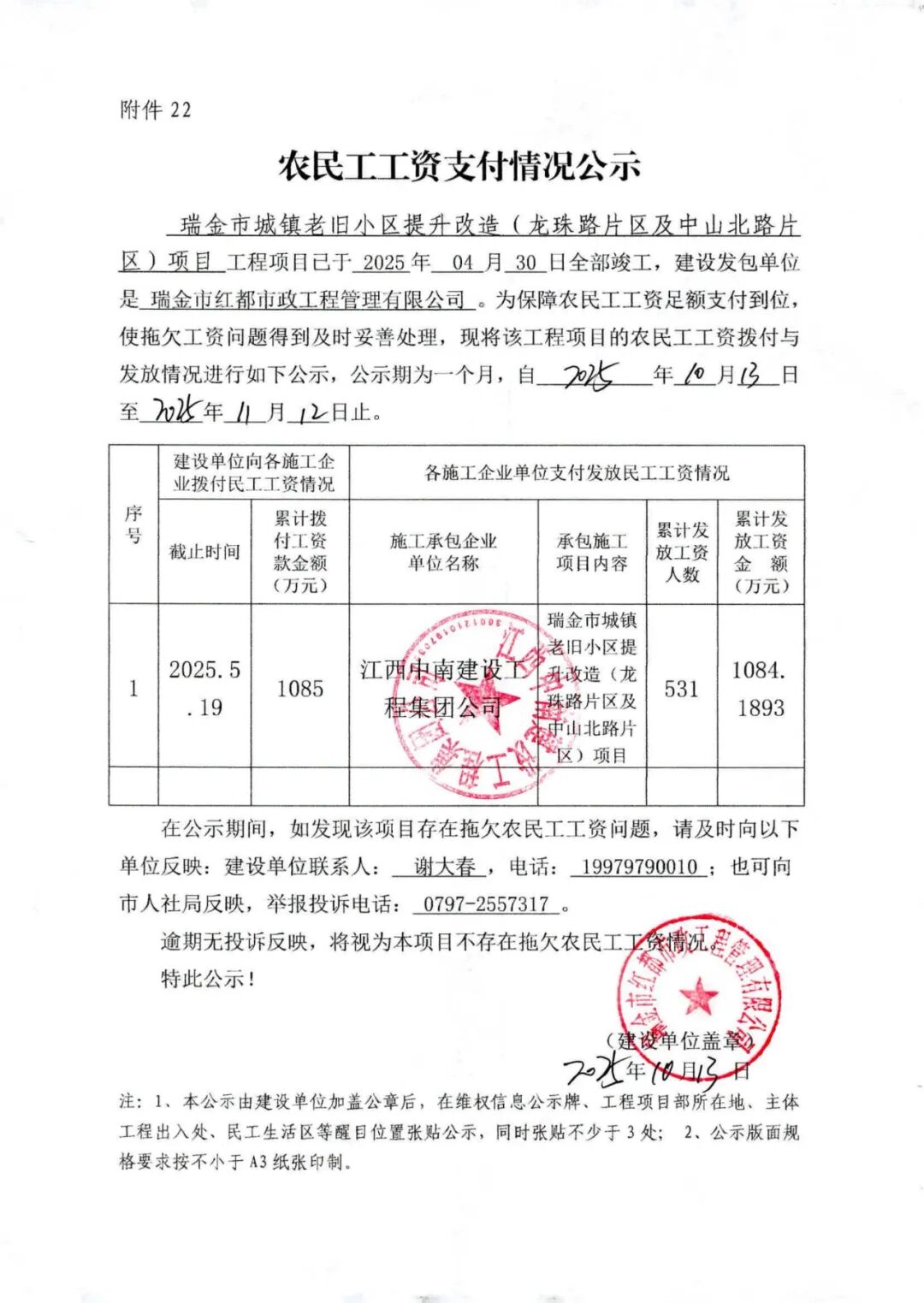 1085万元!瑞金这个项目农民工工资支付情况公示