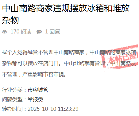 根据您反馈的问题,我局执法人员于2025年10月10日前往中山南路现场调查核实,经核实,情况属实。