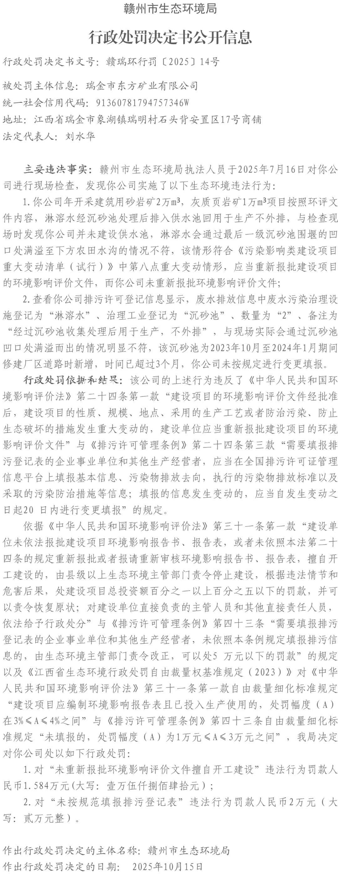 【公告公示】赣州市生态环境局行政处罚决定书公开信息(赣瑞环行罚〔2025〕14号)