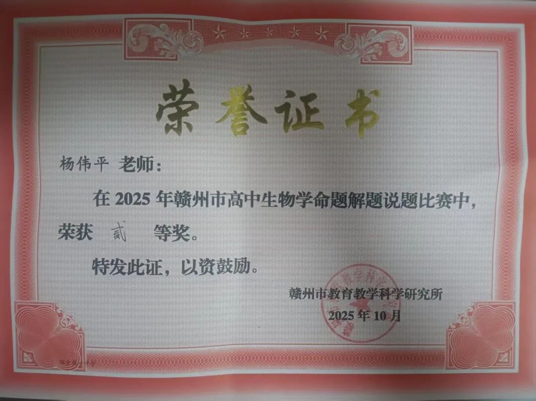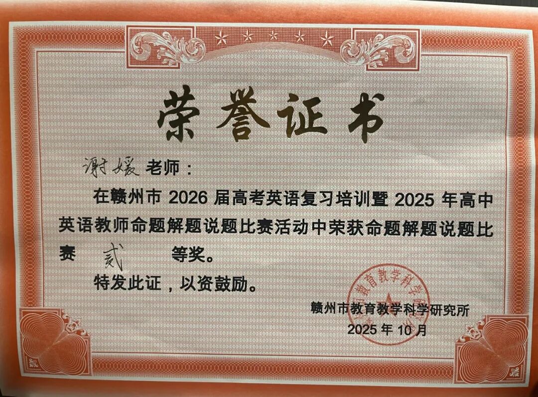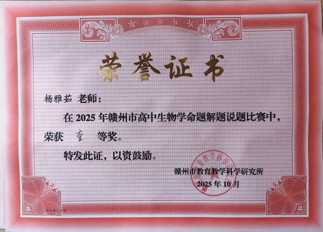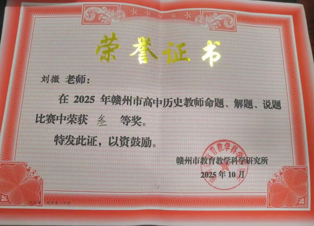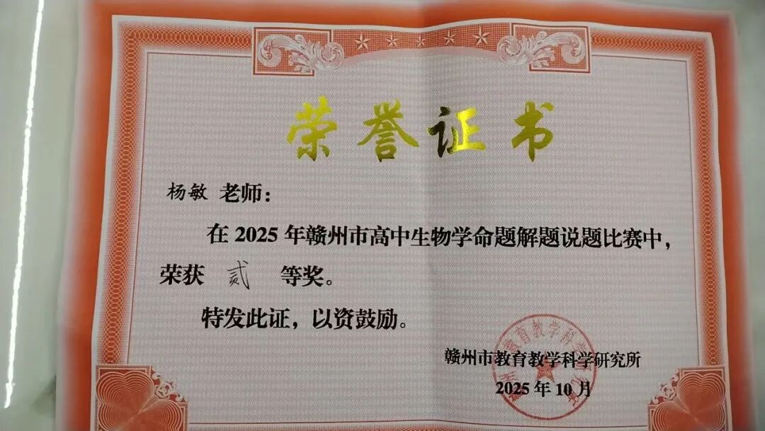 近日,在赣州市教育教学科学研究所组织开展的2025年赣州市高中政治、生物、英语、化学、历史学科教师命题、解题、说题比赛中,我校参赛教师喜获佳绩,获奖情况如下: