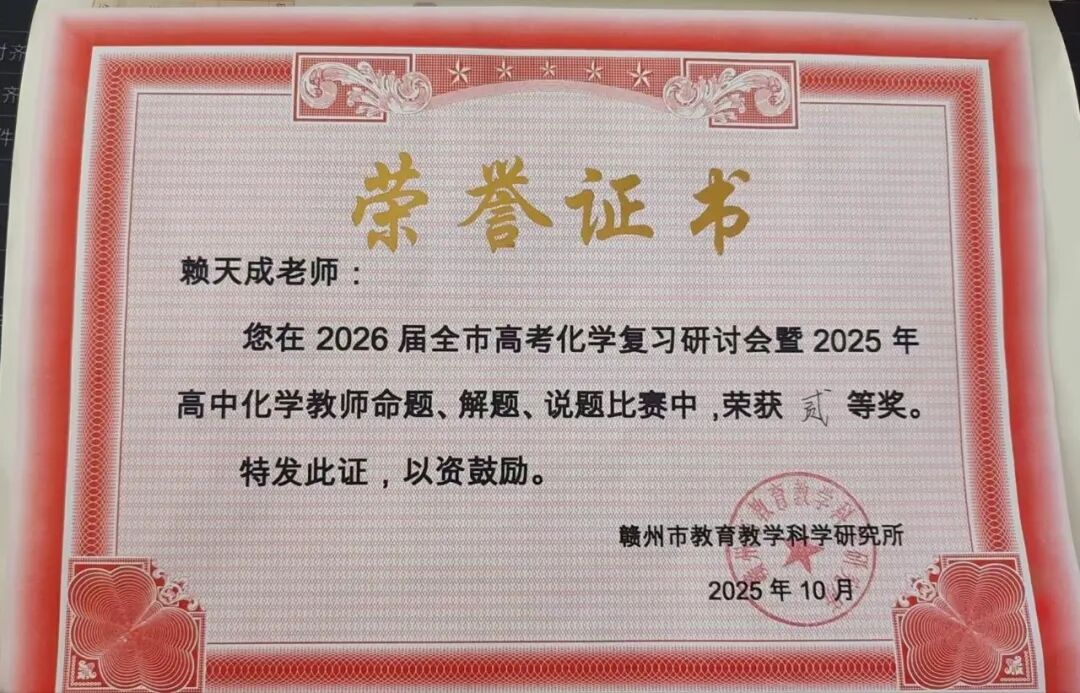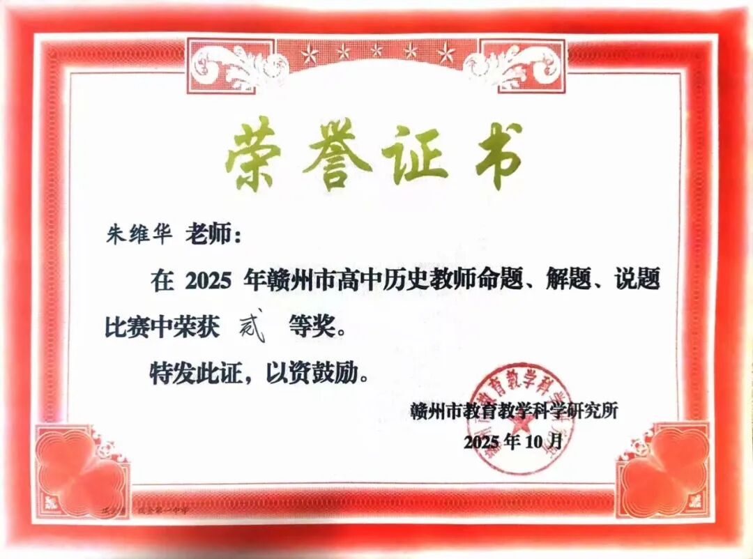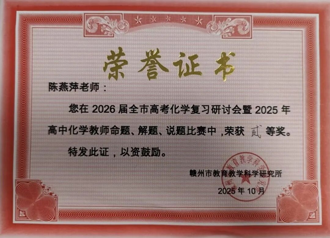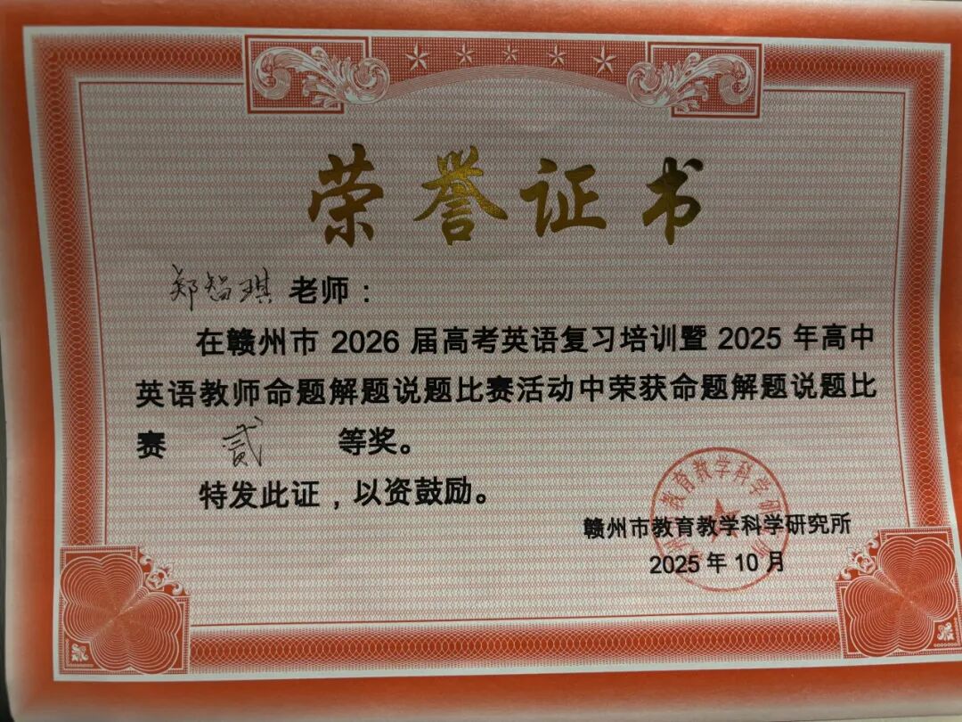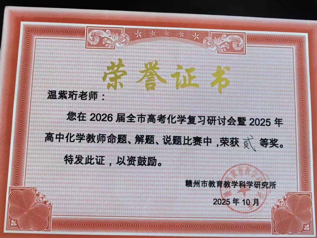 近日,在赣州市教育教学科学研究所组织开展的2025年赣州市高中政治、生物、英语、化学、历史学科教师命题、解题、说题比赛中,我校参赛教师喜获佳绩,获奖情况如下: