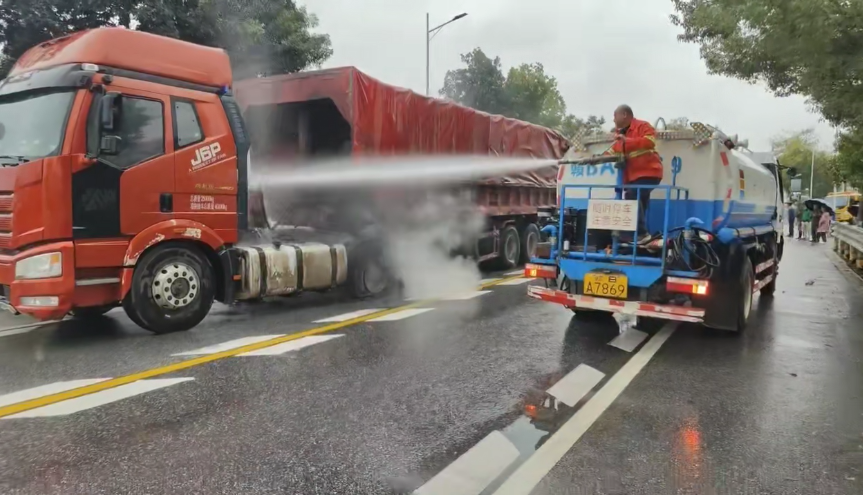 险情就是命令。巡查人员第一时间果断拨打119火警电话并立即上报情况,同时响应瑞金公路分中心应急预案。应急响应机制迅速启动,并通知泽覃养护中心值班人员驾驶洒水车前往现场,配合消防部门处置险情。
