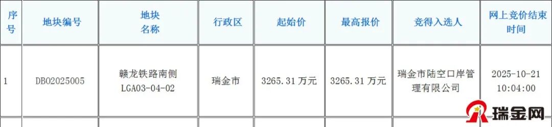 刚刚,瑞金网小编从江西省公共资源交易平台自然资源网上交易系统网站获悉,瑞金市1宗土地竞价成功,成交价为3265.31万元。地块详情如下: