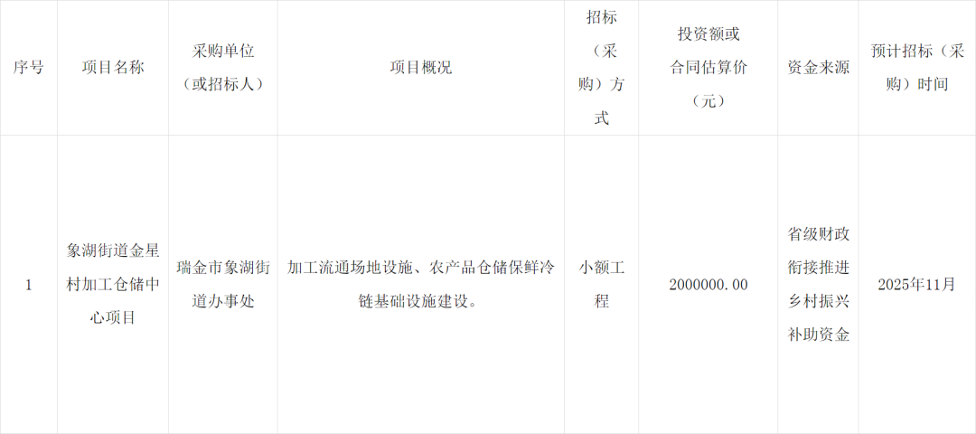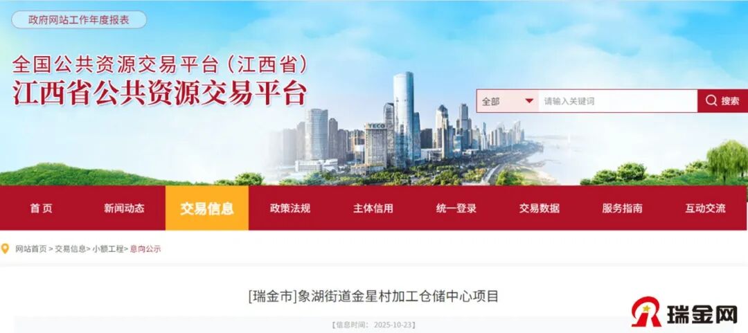 刚刚,瑞金网小编从江西省公共资源交易平台网获悉,瑞金市象湖街道金星村加工仓储中心项目意向公示发布,总投资约2000000元,预计2025年11月招标。