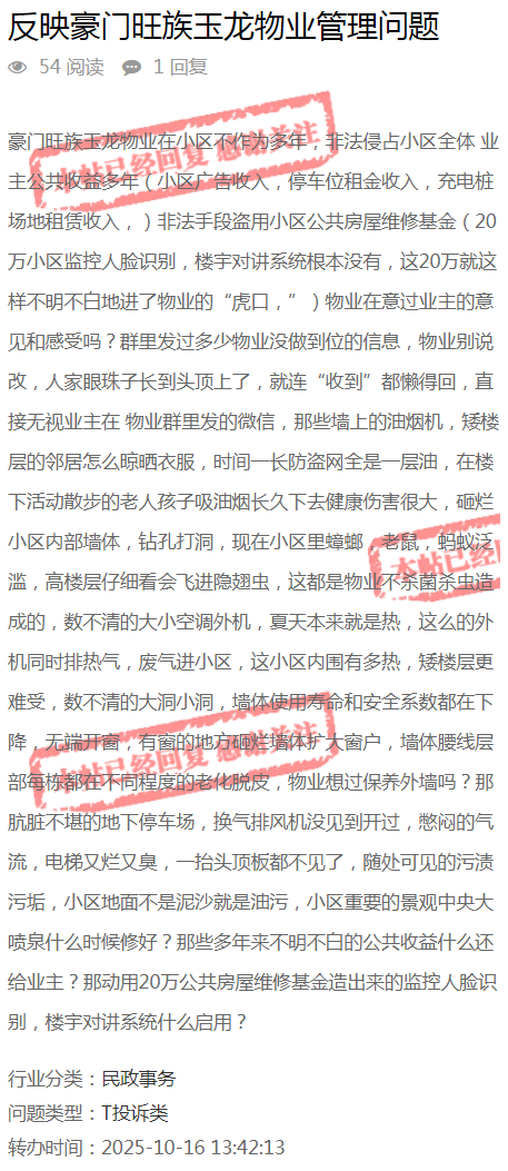刚刚,瑞金网小编从客家新闻网“问政赣州”栏目获悉,有网友在该栏目留言咨询:反映豪门旺族玉龙物业管理问题,针对网友提出的相关问题,瑞金官方作出了明确的回复,具体详情如下:...