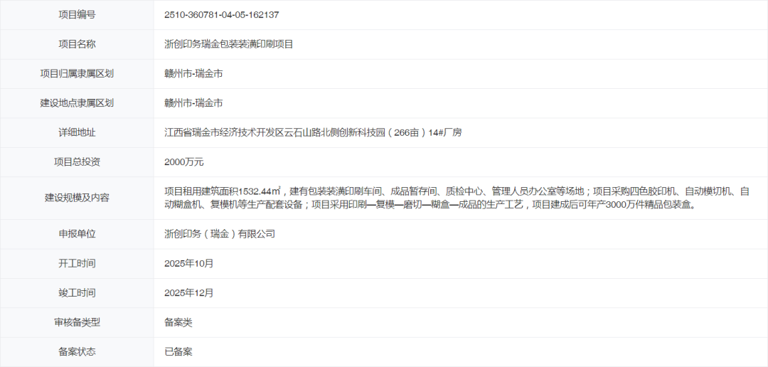 浙创印务瑞金包装装潢印刷项目,位于江西省瑞金市经济技术开发区云石山路北侧创新科技园(266亩)14#厂房,项目总投资2000万元,2025年10月开工,预计2025年12月竣工。建设规模及内容:项目租用建筑面积1532.44㎡,建有包装装潢印刷车间、成品暂存间、质检中心、管理人员办公室等场地;项目采购四色胶印机、自动模切机、自动糊盒机、复模机等生产配套设备;项目采用印刷—复模—磨切—糊盒—成品的生产工艺,项目建成后可年产3000万件精品包装盒。