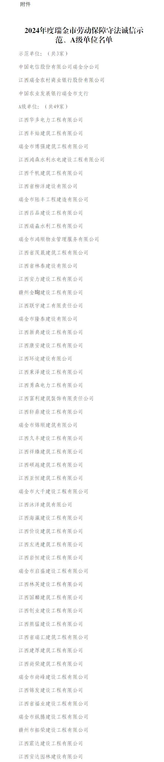附件:2024年度瑞金市劳动保障守法诚信示范、A级单位名单