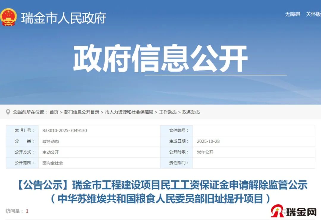 刚刚,瑞金网小编从瑞金市人民政府网部门信息公开目录栏了解到,瑞金市人力资源和社会保障局发布了《【公告公示】瑞金市工程建设项目民工工资保证金申请解除监管公示(中华苏维埃共和国粮食人民委员部旧址提升项目)》,详情如下: