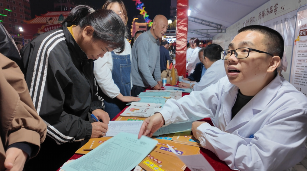 在中医代茶饮、药膳汤品尝区,各种中药养生茶饮和药膳包、足浴包琳琅满目。中医传统保健功法教学区,专业老师正在现场教学太极拳、八段锦等传统功法,市民跟着教练一招一式地练习。在体重管理、中医美容体验区,专业医美团队为市民提供中医美容体验等服务。
