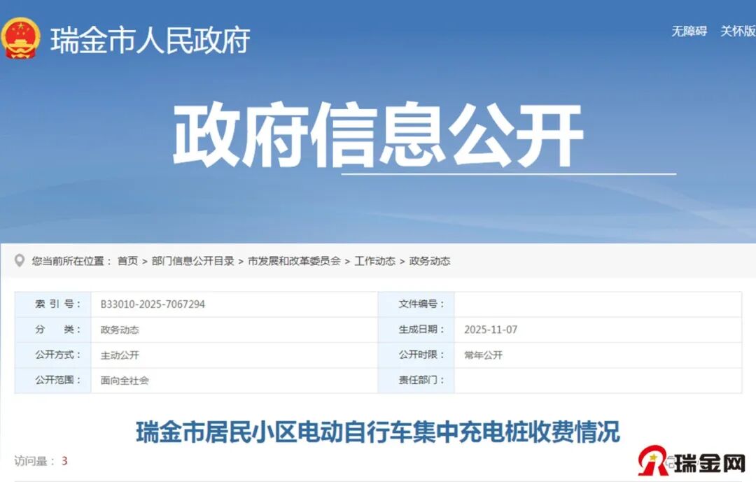刚刚,瑞金网小编获悉,瑞金市人民政府网部门信息公开目录栏,公开了《瑞金市居民小区电动自行车集中充电桩收费情况》,详情如下: