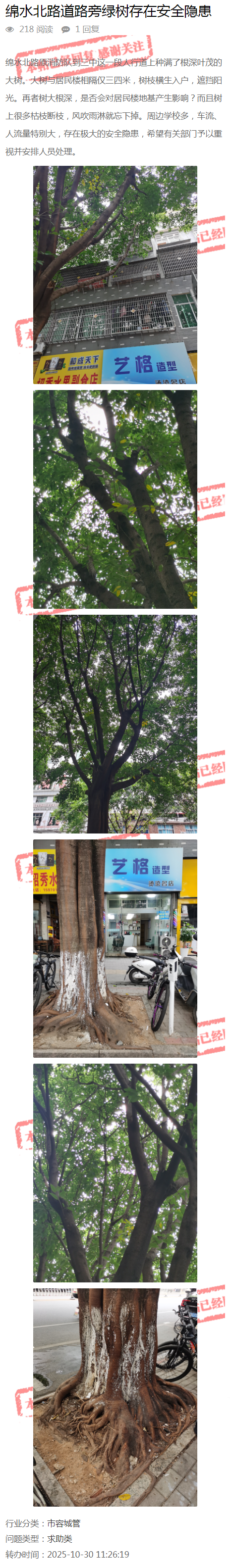 根据您反映的情况,我局园林股工作人员于2025年10月31日赴现场进行了踏勘。经核实,绵水北路原消防队至三中段人行道树木确实存在部分树枝横生入户、遮挡阳光,以及树上有枯枝带来安全隐患等问题。