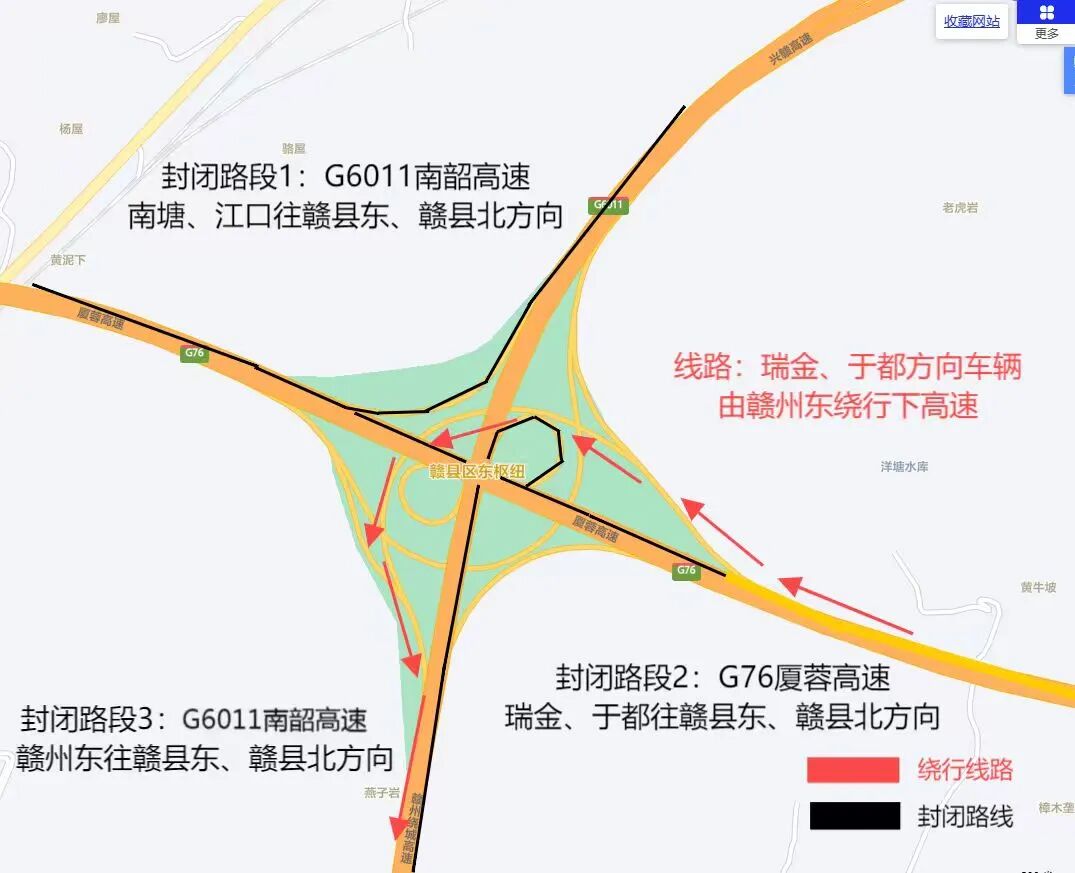 4.G76厦蓉高速赣县东枢纽至赣县北互通上行主线封闭(于都至赣州方向)。同时在赣县东枢纽,南韶高速双向转入厦蓉高速往赣州方向匝道封闭;过往车辆可绕行至G6011南韶高速赣州东收费站。