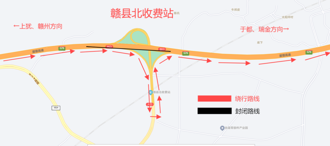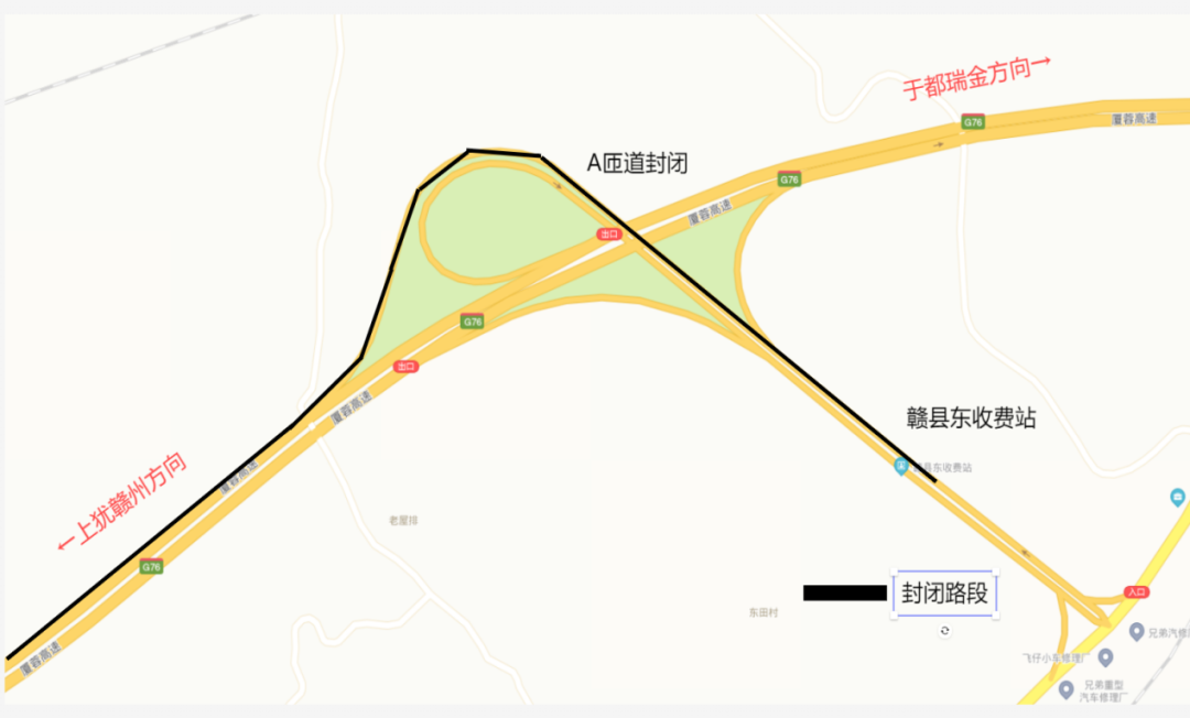2.赣县东收费站上高速往上犹方向(匝道)封闭,往上犹方向车辆可绕行至赣州北、赣州西收费站上高速。