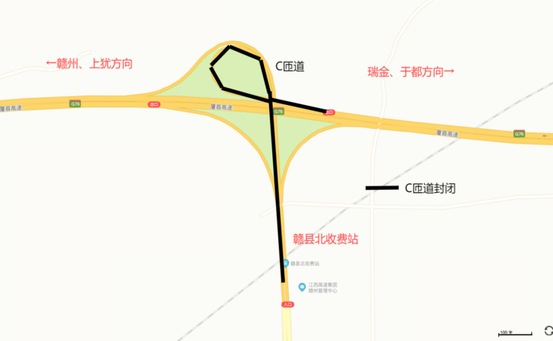 赣县北互通C匝道封闭,瑞金、于都方向至赣县北收费站不能下高速,建议车辆从赣县东收费站或赣州北收费站下高速。