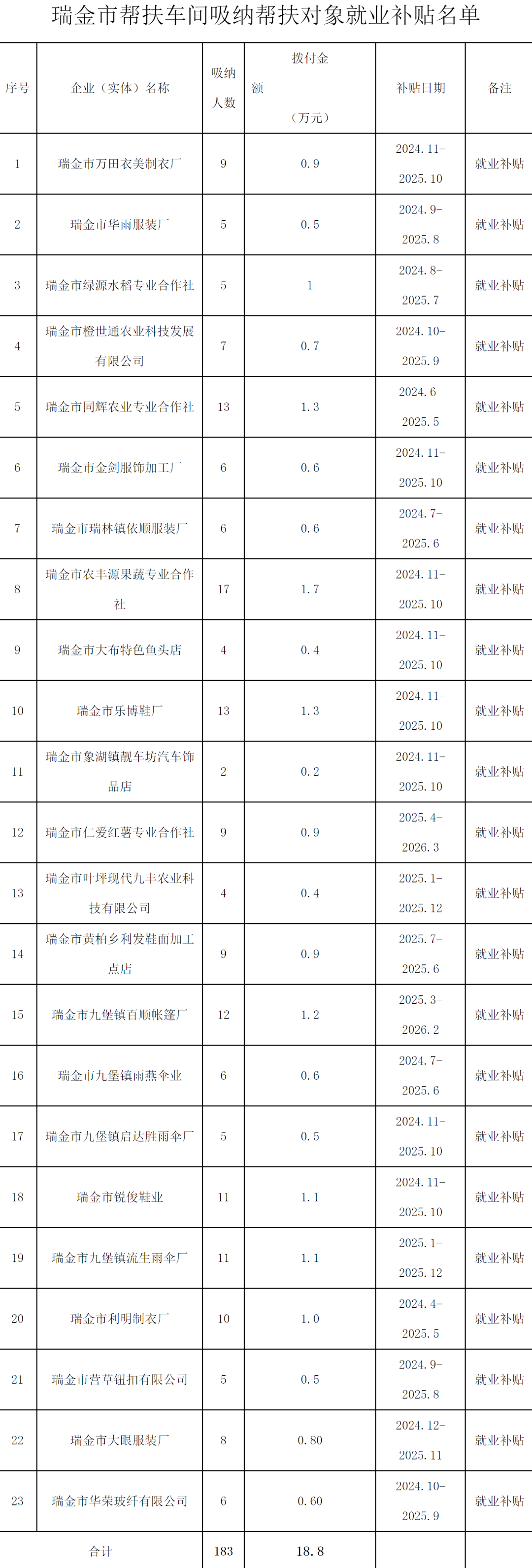 根据《省人社厅 省发改委 省财政厅 省农业农村厅 省乡村振兴局〈关于加强就业帮扶巩固拓展脱贫攻坚成果助力乡村振兴的实施意见〉》(赣人社发〔2021〕14号)《赣州市人社局 赣州市发改委 赣州市财政局 赣州市农业农村局 赣州市乡村振兴局<关于印发赣州市加强就业帮扶巩固拓展脱贫攻坚成果助力乡村振兴若干措施的通知>》(赣市人社发〔2021〕5号)的文件精神,现将瑞金市万田衣美制衣厂、瑞金市华雨服装厂、瑞金市绿源水稻专业合作社、瑞金市橙世通农业科技发展有限公司、瑞金市同辉农业专业合作社、瑞金市金剑服饰加工厂、瑞金市瑞林镇依顺服装厂、瑞金市农丰源果蔬专业合作社、瑞金市大布特色鱼头店、瑞金市乐博鞋厂、瑞金市象湖镇靓车坊汽车饰品店、瑞金市仁爱红薯专业合作社、瑞金市叶坪现代九丰农业科技有限公司、瑞金市黄柏乡利发鞋面加工点店、瑞金市九堡镇百顺帐篷厂、瑞金市九堡镇雨燕伞业、瑞金市九堡镇启达胜雨伞厂、瑞金市锐俊鞋业、瑞金市九堡镇流生雨伞厂、瑞金市利明制衣厂、瑞金市瑞金市营草钮扣有限公司、瑞金市大眼服装厂、瑞金市华荣玻纤有限公司享受就业补贴名单予以公示: