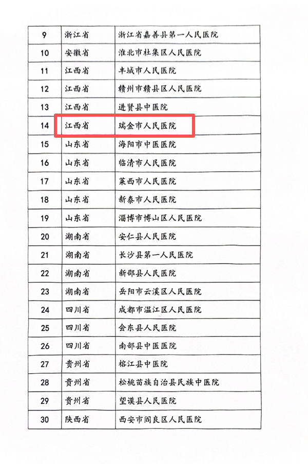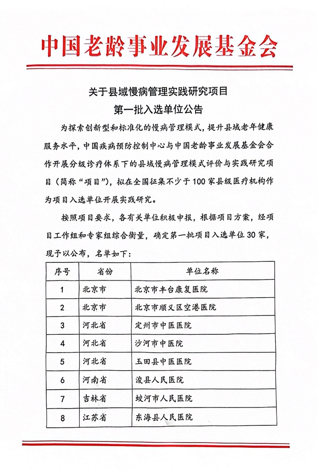 根据中国疾病预防控制中心关于开展县域慢病管理实践研究的通知,瑞金市总医院人民医院院区对照申报要求,组织自评小组通过现场调研、资料核查、指标分析等方式进行综合评估,积极对接项目申报工作。11月11日,中国老龄事业发展基金会发布《关于县域慢病管理实践研究项目第一批入选单位公告》,全国共30家单位凭借扎实的慢病管理基础与创新实践潜力成功入选。其中,瑞金市总医院人民医院院区位列其中。