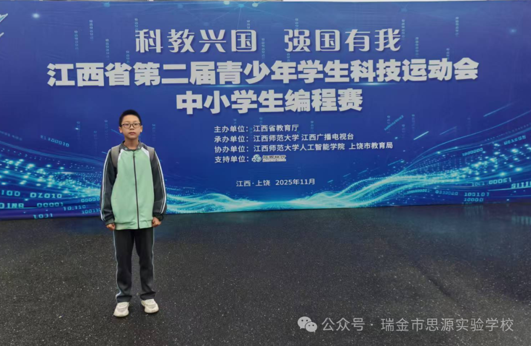 在2025年江西省第二届青少年学生科技运动会中小学生编程比赛中,我校六(6)班谢天佑同学历经多轮市级选拔赛的激烈角逐,最终成功晋级省赛。在强手如云的省级决赛现场,他凭借扎实的编程功底与出色的临场发挥,在编程项目(现场答辩与考试)中脱颖而出,一举斩获江西省一等奖的优异成绩!