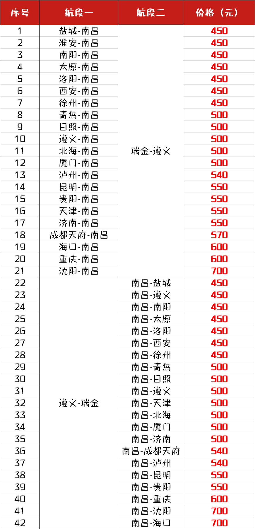 同时购买江西航空南昌进港航班及瑞金-遵义航线或江西航空南昌出港航班及遵义-瑞金航线,可享低至450元的机票福利。