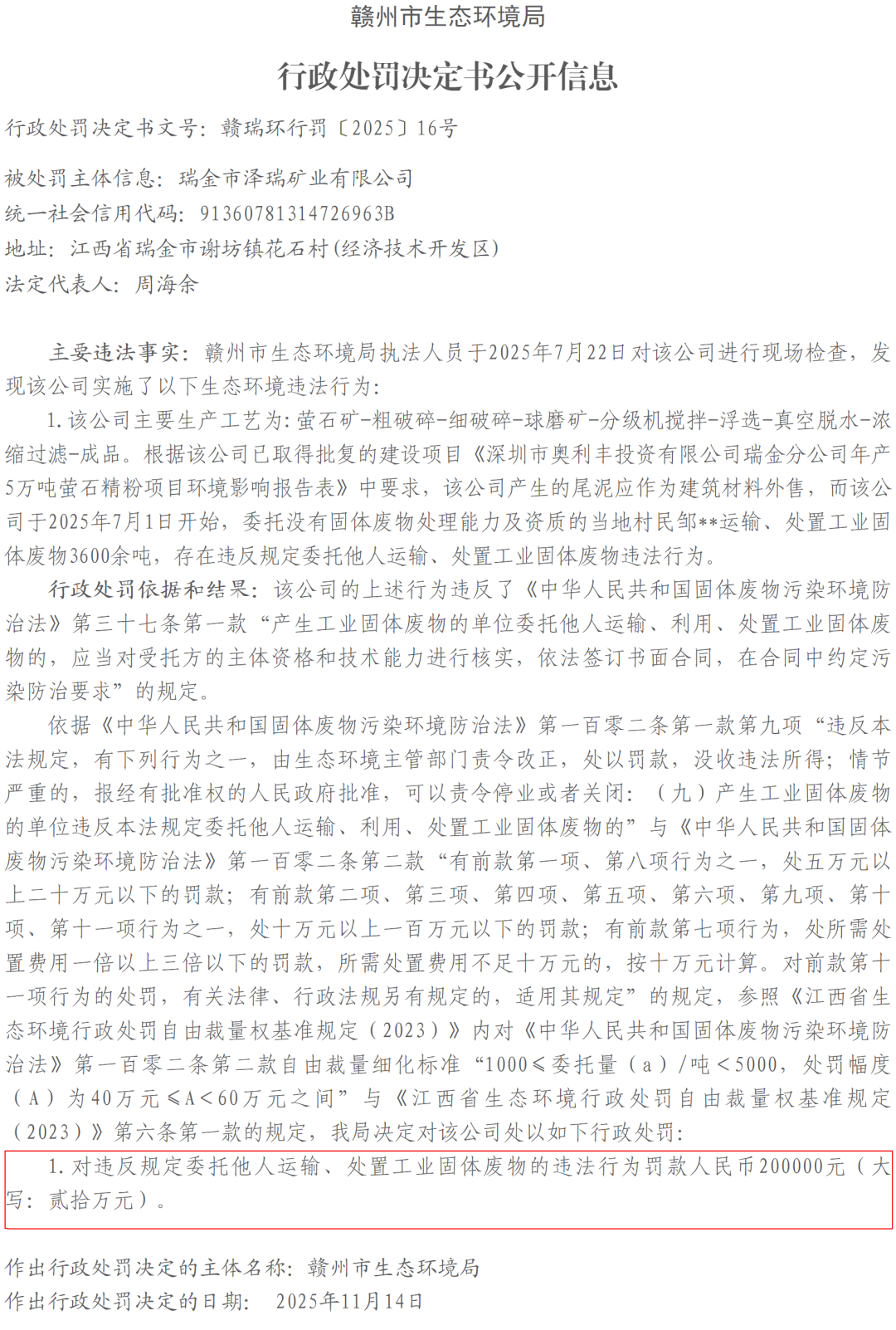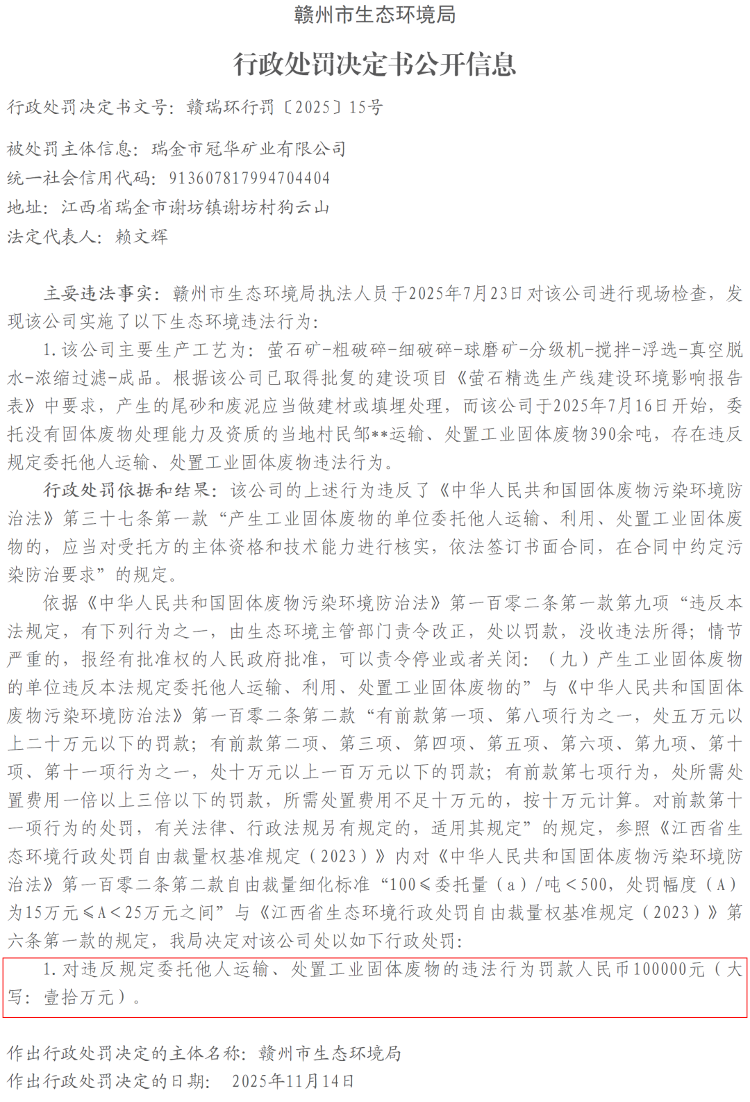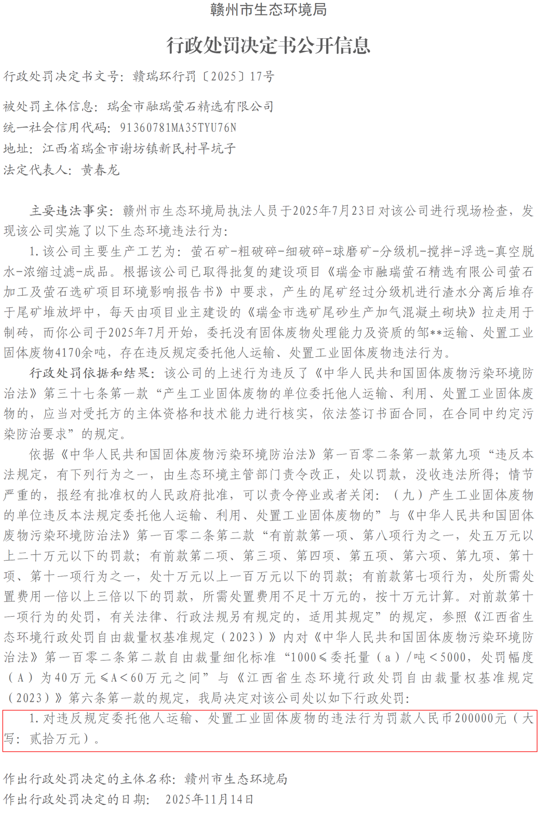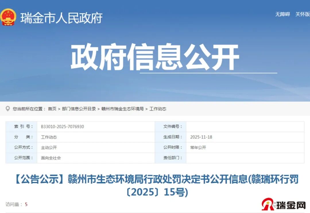 刚刚,瑞金网小编从瑞金市人民政府网部门信息公开目录了解到,赣州市瑞金生态环境局发布了《【公告公示】赣州市生态环境局行政处罚决定书公开信息(赣瑞环行罚〔2025〕15号)》,详情如下: