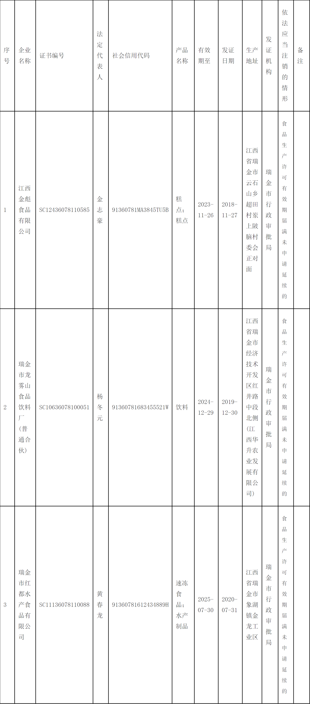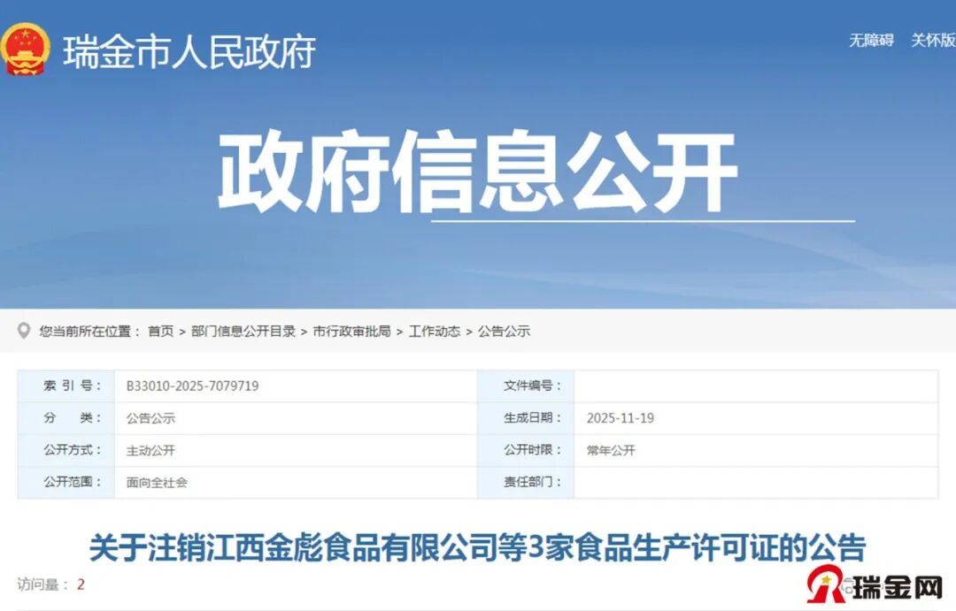 关于注销江西金彪食品有限公司等3家食品生产许可证的公告