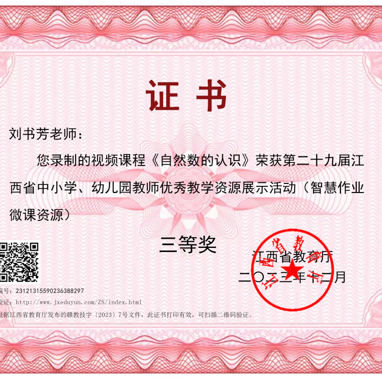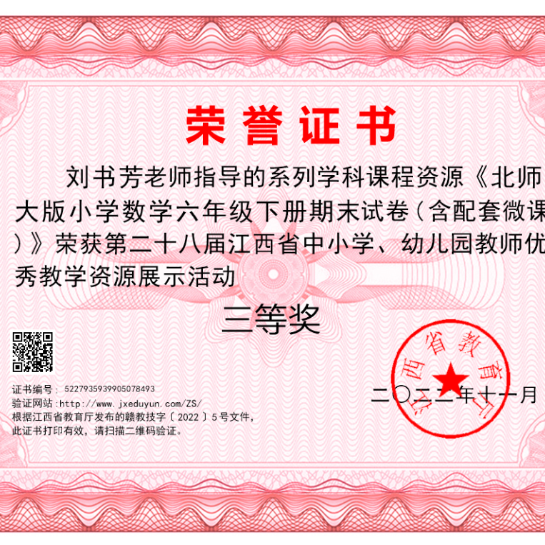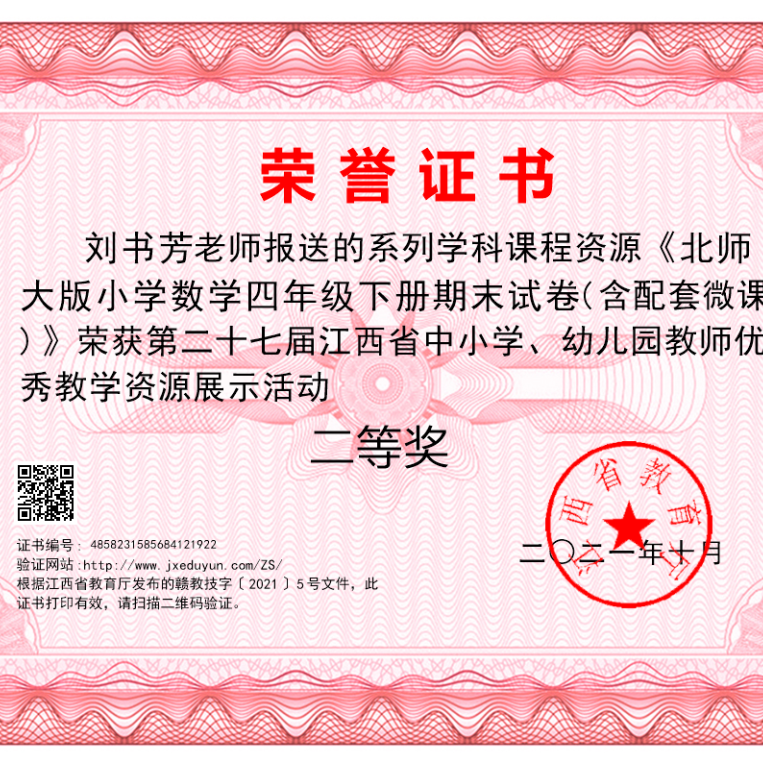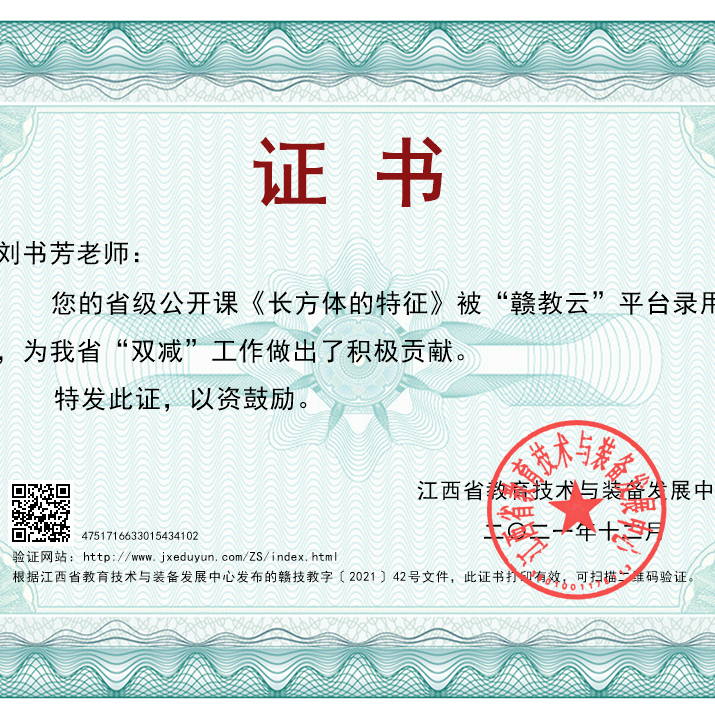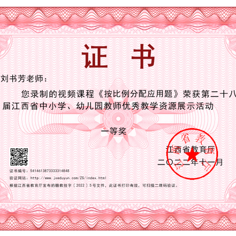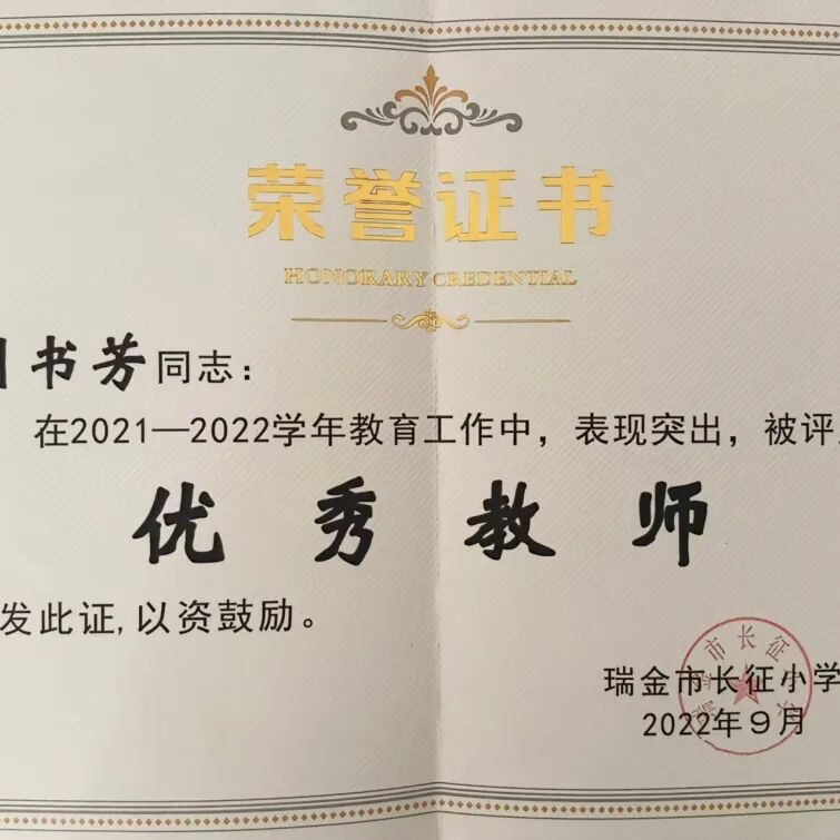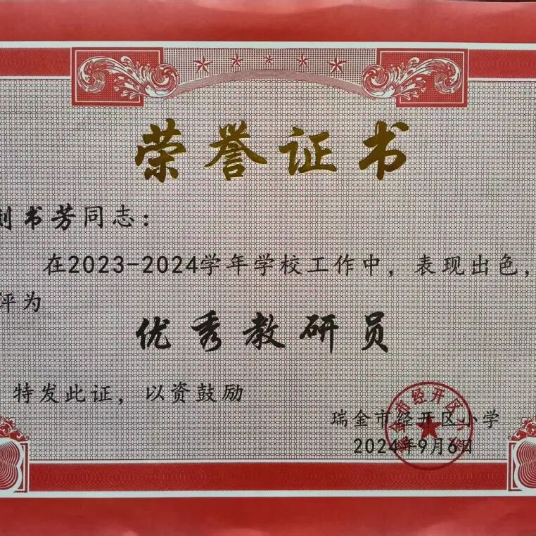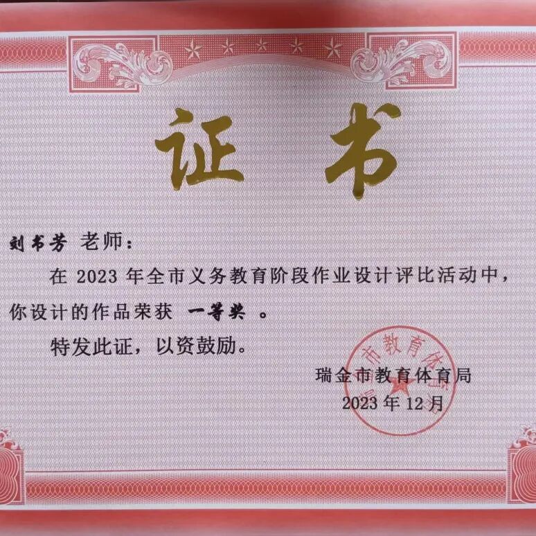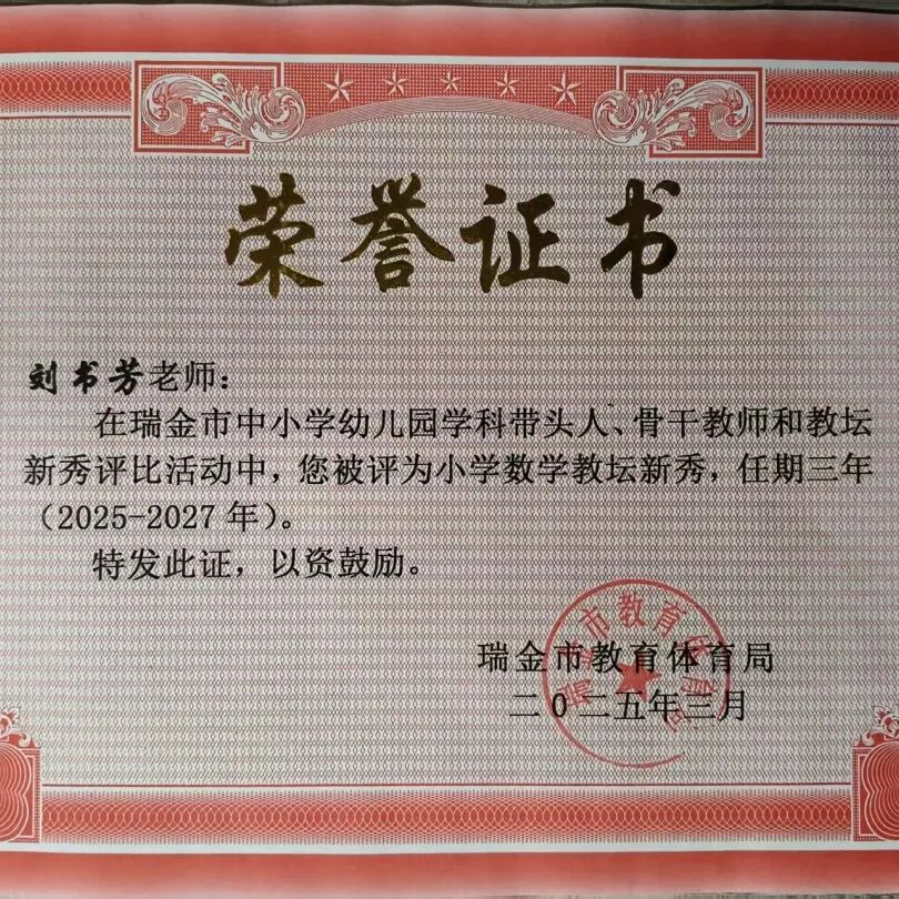 十年耕耘,硕果盈枝。凭借扎实的业务能力与突出的育人成效,刘书芳老师先后荣获 “优秀教师”“优秀教研员” “教坛新秀” 等荣誉称号,并多次参加瑞金市科学竞赛,获得良好的名次。2022 年 11月,她更是荣获“第二十八届江西省中小学、幼儿园教师优秀教学资源展示活动一等奖”。这些荣誉的背后,是她以 “勤” 鞭策自我、以 “钻” 提升业务的体现。