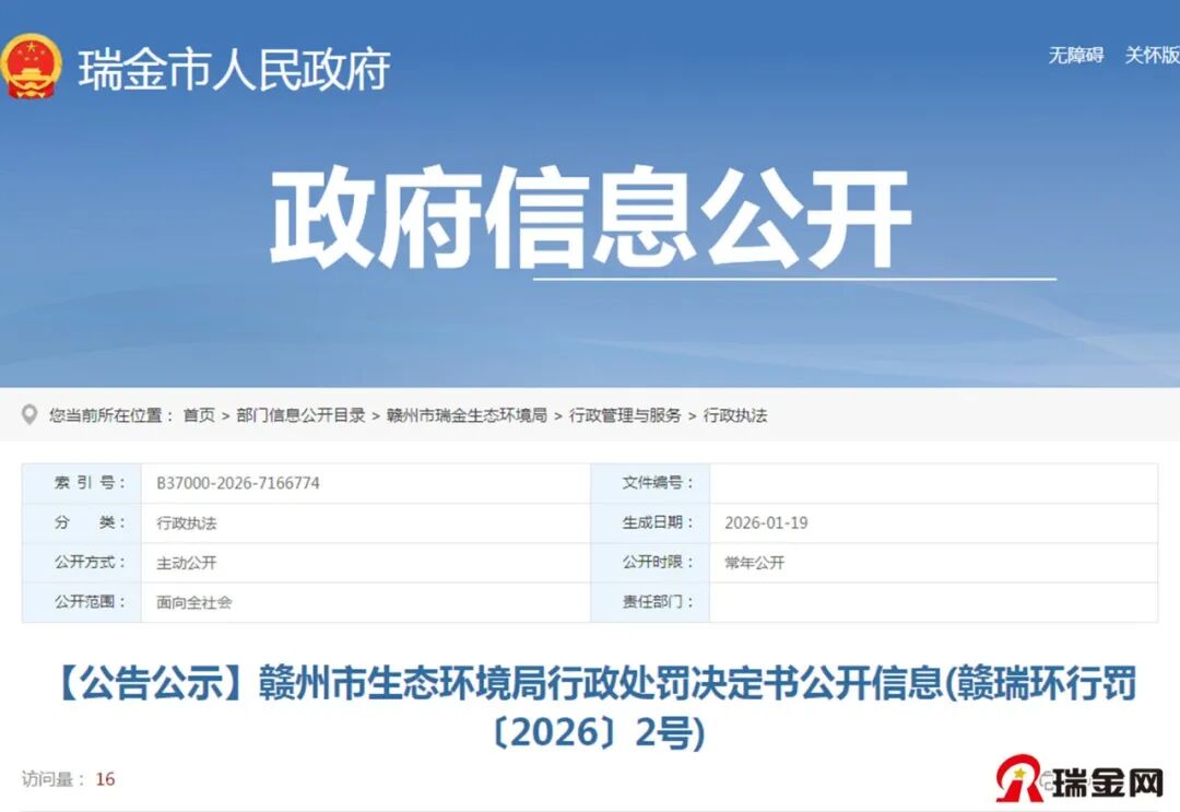 刚刚,瑞金网小编从瑞金市人民政府网部门信息公开目录栏了解到,赣州市瑞金生态环境局发布了《【公告公示】赣州市生态环境局行政处罚决定书公开信息(赣瑞环行罚〔2026〕2号)》,详情如下: