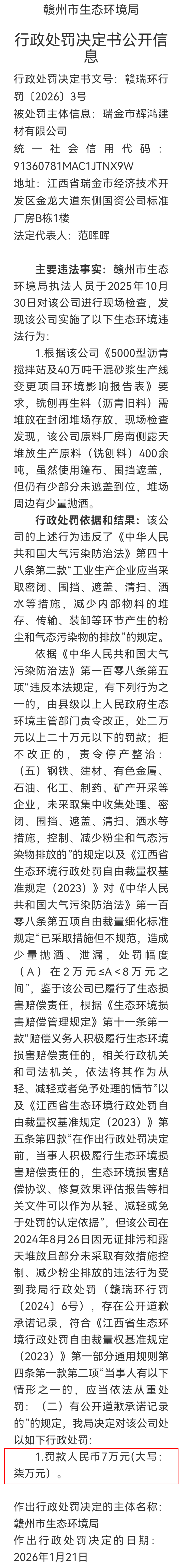 刚刚,瑞金网小编从瑞金市人民政府网部门信息公开目录栏了解到,赣州市瑞金生态环境局发布了《【公告公示】赣州市生态环境局行政处罚决定书公开信息(赣瑞环行罚〔2026〕3号)》,详情如下: