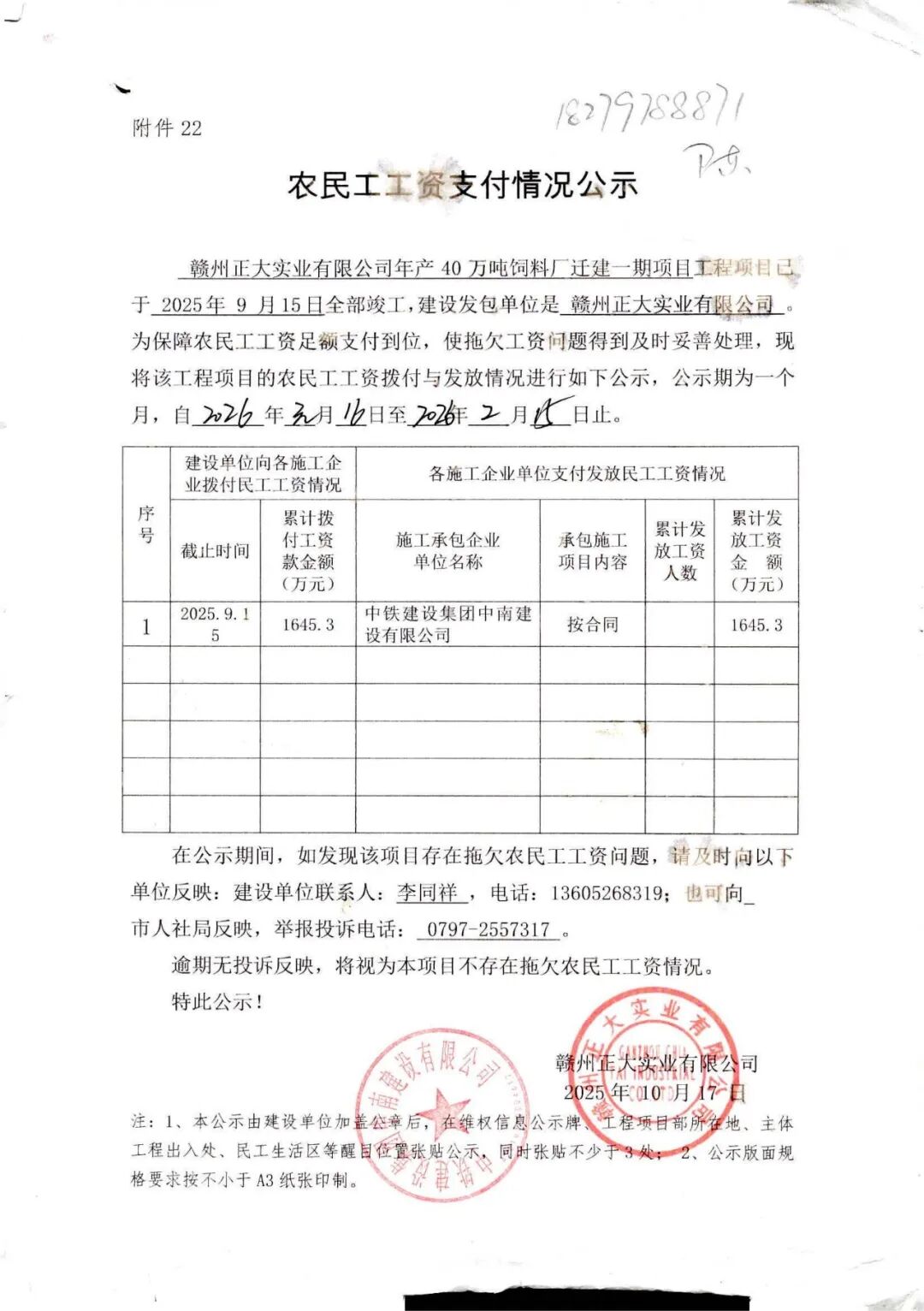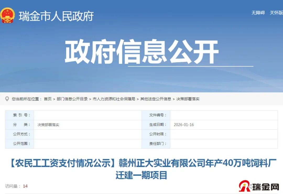 刚刚,瑞金网小编从瑞金市人民政府网部门信息公开目录栏了解到,公开了《【农民工工资支付情况公示】赣州正大实业有限公司年产40万吨饲料厂迁建一期项目》,详情如下:
