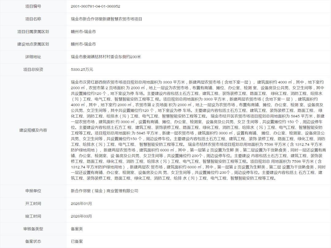 瑞金市新合作邻里新建智慧农贸市场项目,位于瑞金市象湖镇桔林村村委会东侧约230米,项目总投资5330.25万元,2026年1月开工,预计2026年3月竣工。建设规模及内容:瑞金市汉昇红郡西侧农贸市场项目规划总用地面积为 3303 平方米,新建两层农贸市场(含地下室一层), 建筑面积约 4000 ㎡,其中,地下室约 2000 ㎡,农贸市第 2 页场面积 为 2000 ㎡,地上一层设为农贸市场,布置有商铺、摊位、办公室、检测 室、设备房及公共男、女卫生间等,其中共设置摊位约120 个,地下室设为停 车场。主要建设内容包括土石方工程、建筑工程、装饰装修工程、路面工程、 绿化工程、消防工程、给排水(污)工程、电气工程、智慧智能安防工程等工程。瑞金市经开区农贸市场项目规划总用地面积为 5845 平方米,新建一层农贸市场,建筑面积 约 3000 ㎡,设置有商铺、摊位、办公室、检测室、设备房及公共男、女卫 生间等,共设置摊位约 150 个,周边设停车位。主要建设内容包括土石方工 程、建筑工程、装饰装修工程、路面工程、绿化工程、消防工程、给排水 (污)工程、电气工程、智慧智能安防工程等工程。 瑞金市桔林农贸市场项目规划总用地面积为 7598 平方米(含 1312.74 平方米防护绿地用地), 新建两层农贸市场,建筑面积约 6000 ㎡,其中,第一层第 2 页设置为生鲜 类,第二层设置为干货熟食类,同时一层还设置有商铺、办公室、检测室、设 备房及公共男、女卫生间等,共设置摊位约 230个,周边设停车位。主要建设 内容包括土石方工程、建筑工程、装饰装修工程、路面工程、绿化工程、消防 工程、给排水(污)工程、电气工程、智慧智能安防工程等工程。