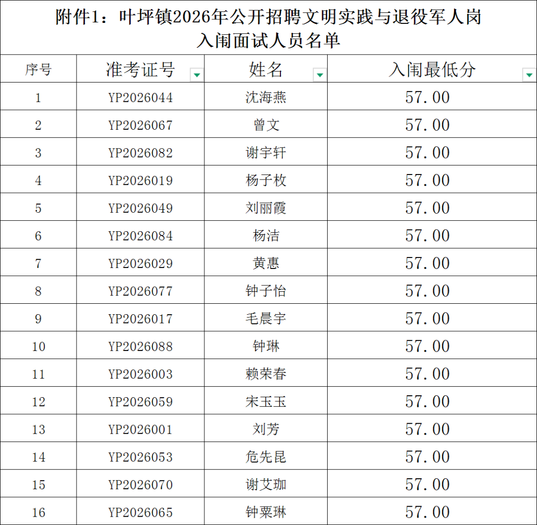 按照招聘公告规定,根据岗位笔试成绩,按岗位招聘计划数1:2的比例,分别从高分到低分确定本次考试入闱面试人员,笔试成绩须达到57分及以上(如遇末位同分情况,同分人员一并入闱面试)。具体名单详见附件1《叶坪镇公开招聘文明实践与退役军人岗工作人员入闱面试人员名单》。