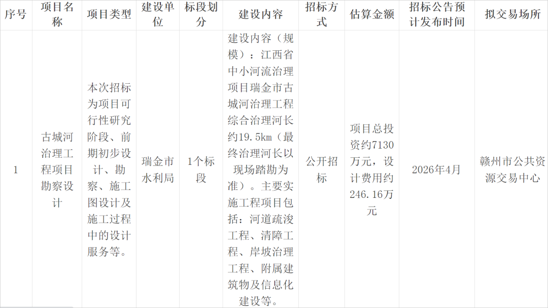 [瑞金市]古城河治理工程项目勘察设计招标计划