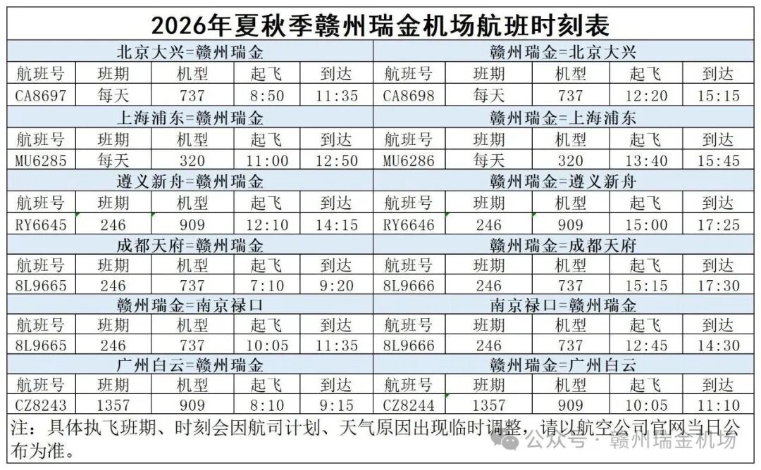 瑞金机场夏秋季航班时刻来啦(含广州、成都、南京航线)