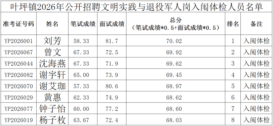 叶坪镇2026年公开招聘文明实践与退役军人岗入闱体检人员名单及体检有关事项公告根据《叶坪镇2026年公开招聘文明实践员与退役军人服务岗公告》相关规定,经报名、资格审查、笔试、面试等程序,现将入闱体检人员名单及体检有关事项公告如下:二、体检标准