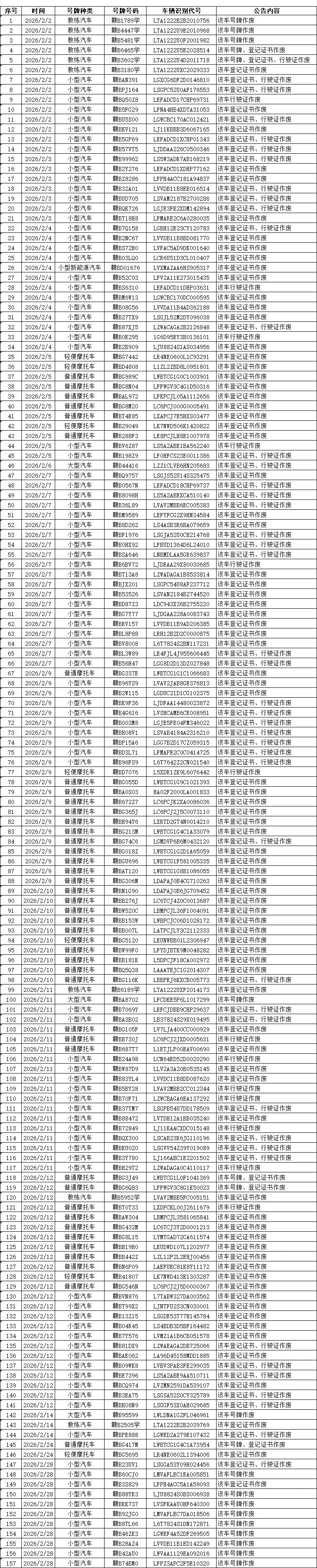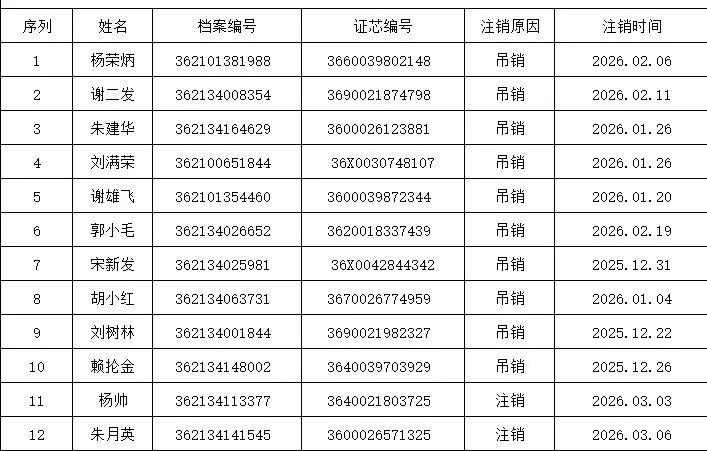 根据《机动车登记规定》(公安部令第164号)第四十一条规定、《机动车驾驶证申领和使用规定》(公安部令第172号)第七十九条之规定,对以下机动车所有人办理注销登记时未交回机动车登记证书、号牌、行驶证的;驾驶证依法被注销,因驾驶证未收回的,现予以公告作废。